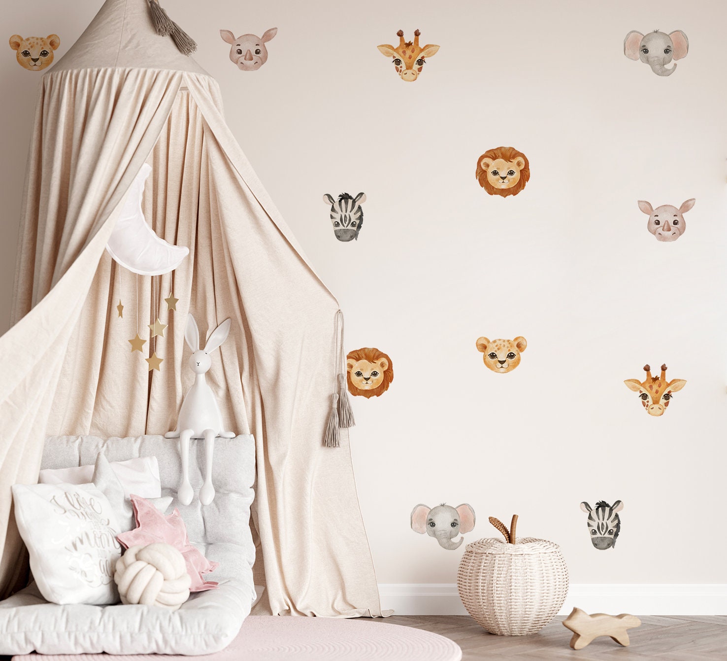 Vytvorte pre svoje dieťa dokonalý priestor s týmito krásnymi safari nálepkami na stenu, ktoré obsahujú zebru, slona, tigra, žirafu, nosorožca a leva. Nálepka na stenu je jedným z najnovších trendov v oblasti bytových dekorácií. Nálepky si môžete rozmiestniť jednotlivo po celej stene podľa vlastných predstáv. Ľahko sa aplikujú a nezanechávajú na stenách zvyšky!