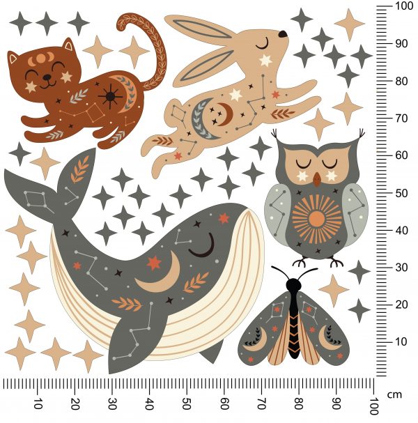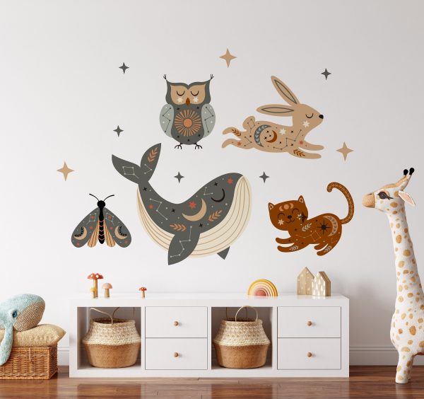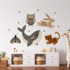 Máte doma malého milovníka zvierat? Naša krásna sada samolepiek na stenu určite poteší dušu vášho drobca. Táto súprava sa skladá z 5 zvieratiek – sovy, veľryby, zajaca, mačky a motýľa.