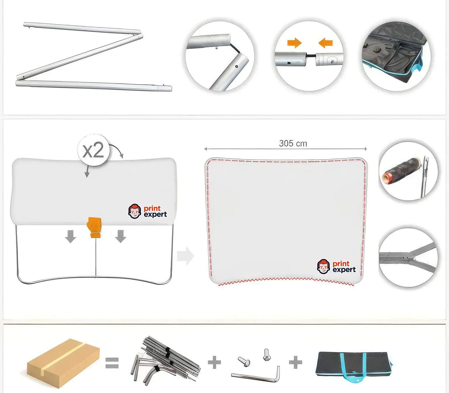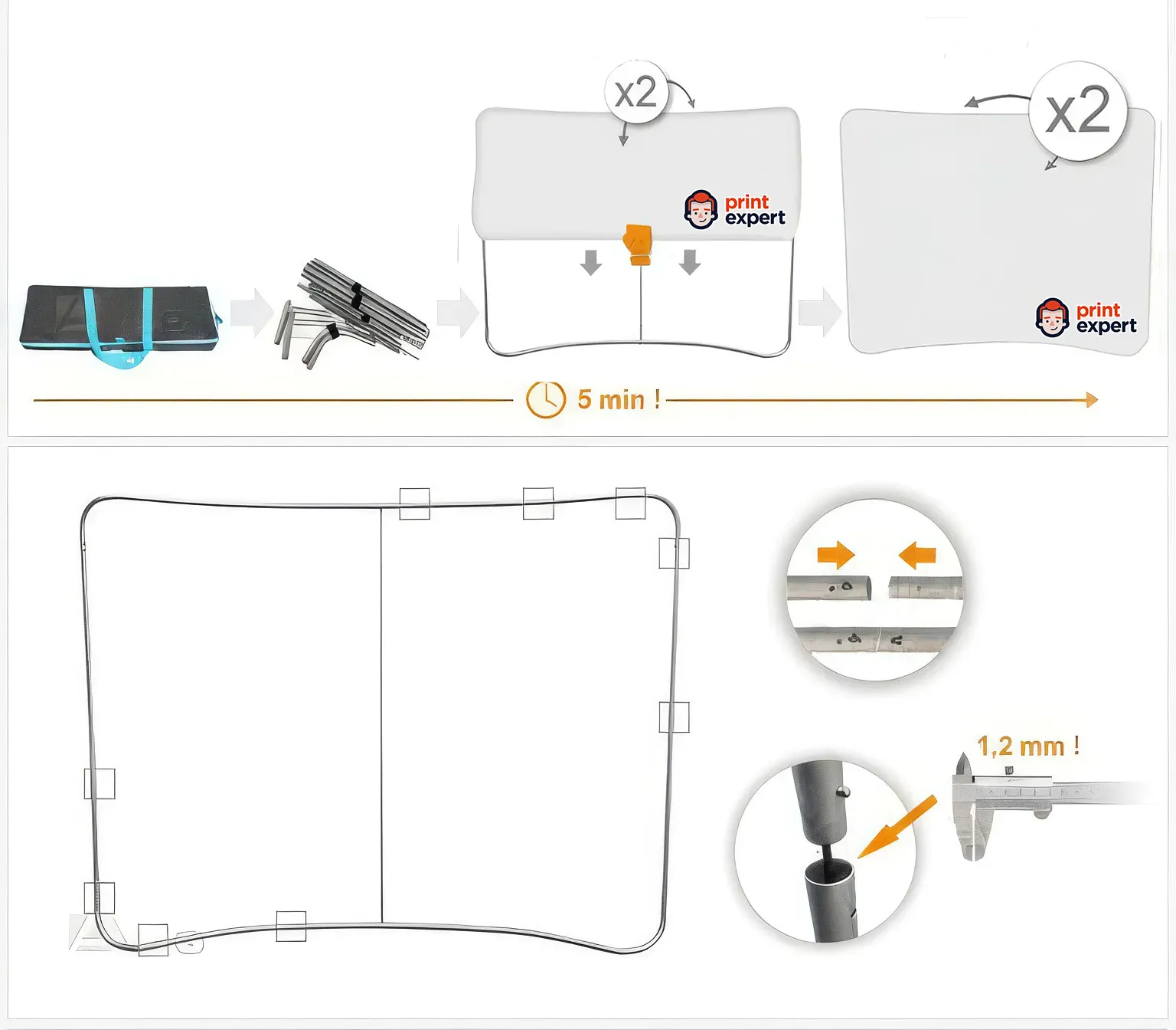 Profesionálna prezentačná stena vhodná na výstavy, eventy, predajne a foto zóny. Grafika je potlačená na kvalitnej textílii, ktorá sa navlieka na konštrukciu ako obal. Zhora ju jednoducho nasuniete a dole uzavriete „bleskovým zámkom“ – výmena je rýchla, čistá a bez náradia.
