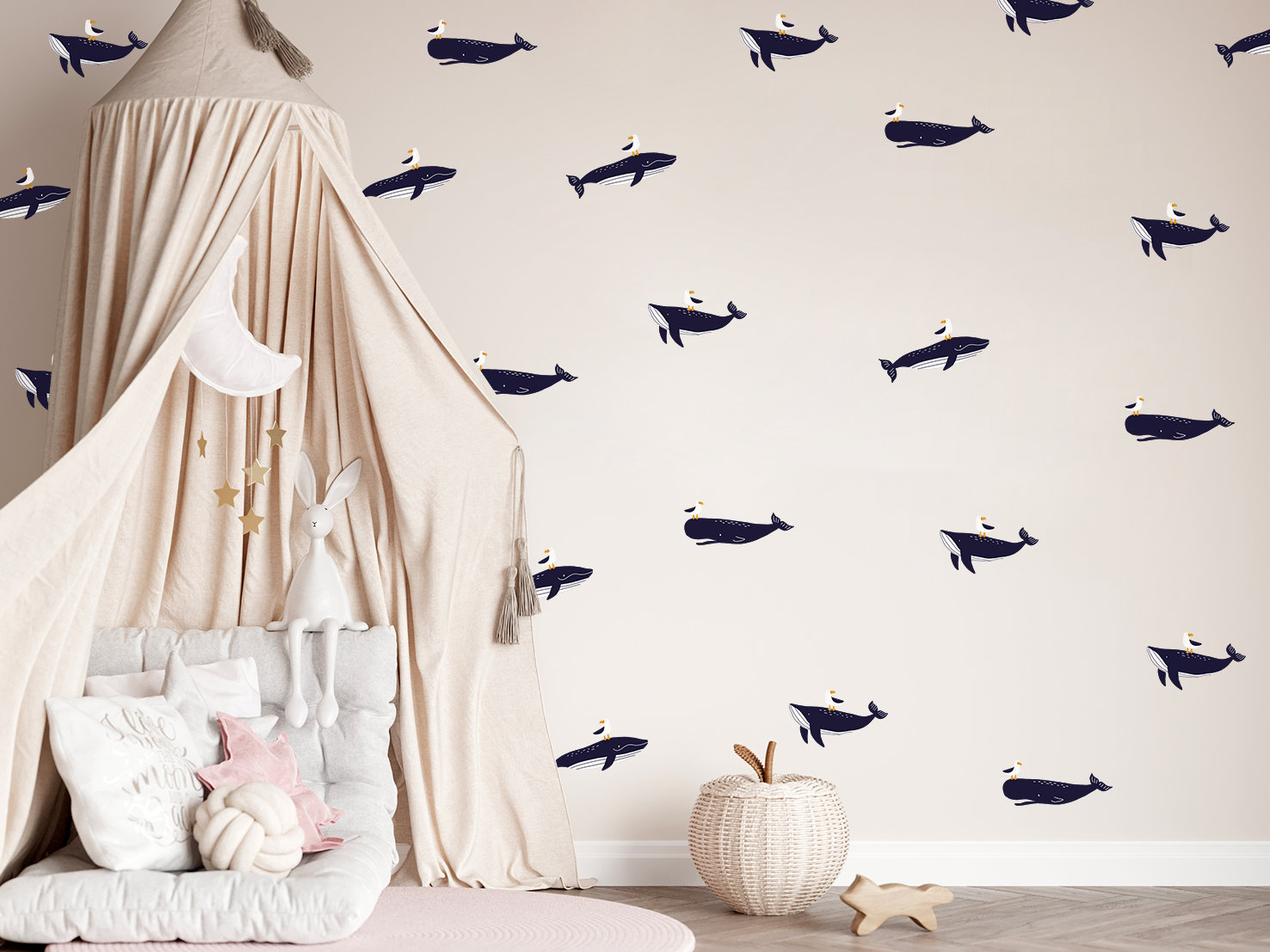 Vytvorte pre svoje dieťa dokonalý priestor pomocou našich samolepiek na stenu s veľrybami. Nálepka na stenu je jedným z najnovších trendov v oblasti bytových dekorácií. Nálepky si môžete rozmiestniť jednotlivo po celej stene podľa vlastných predstáv. Ľahko sa aplikujú a nezanechávajú na stenách stopy!